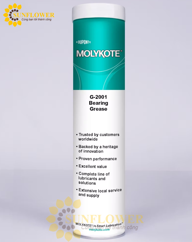 Molykote G-2001 không chứa chất bôi trơn rắn nên rất thích hợp cho các bạc đạn của các thành phần lăn kích thước từ nhỏ đến vừa ở tốc độ cao. Hoạt động được trên phạm vi nhiệt độ rộng hoặc tiếp xúc với nước; tính kháng nước tuyệt vời, các tính nhiệt độ thấp và độ ổn định nhiệt tốt, tính ức chế ăn mòn tốt.